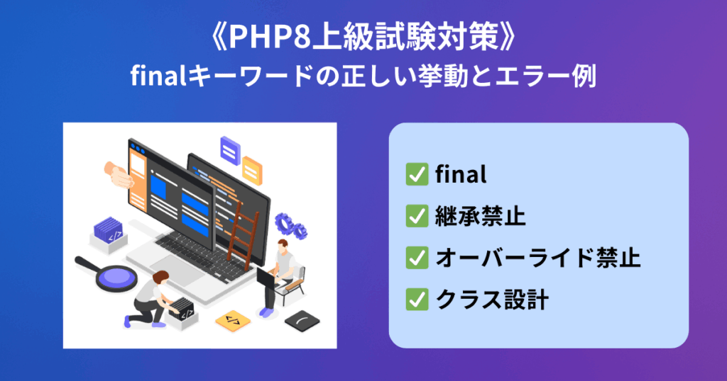 はじめに PHP では final キーワードを使うことで「これ以上の拡張ができない」状態を指定できます。クラスやメソッドに対して利用でき、試験でも頻出のポイントです。... -