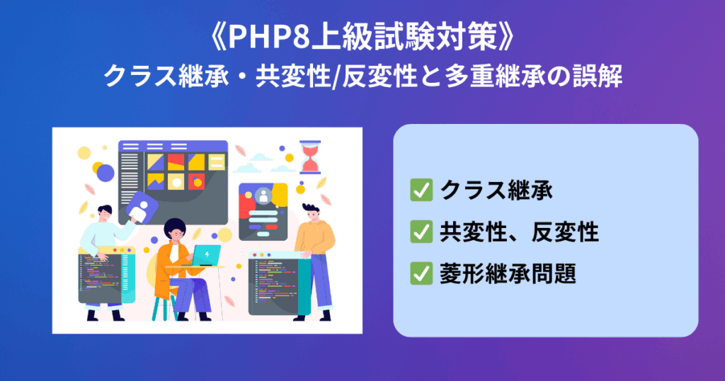 はじめに PHP8の上級試験では、クラス継承に関する「共変性・反変性」や「多重継承の可否」が頻出テーマです。特に「戻り値の型は狭くできる」「引数の型は広げられる」... -
