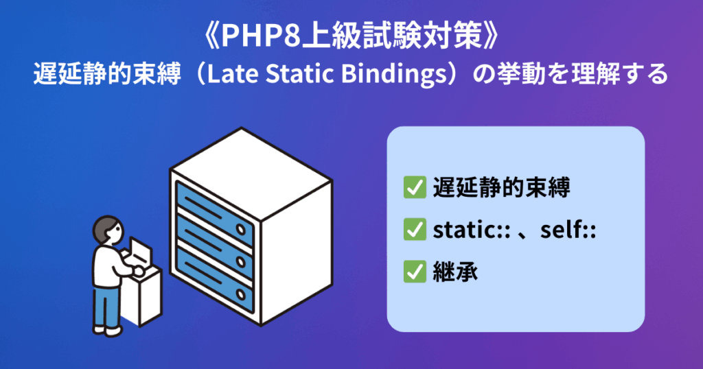 はじめに PHPの継承において「self:: と static:: の違い」は、試験でも実務でも頻出の落とし穴です。本記事では、遅延静的束縛(Late Static Bindings, LSB) の仕組み... -