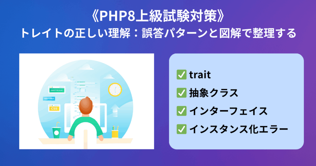 はじめに PHPの上級試験では、トレイト(Trait)に関する出題が頻出です。しかし「クラスに似ているのにインスタンス化できない」という特性から、誤解してしまう受験者... -