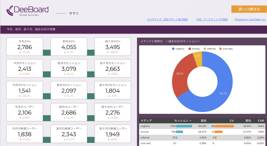 標準のGA4レポートだけだと見づらい部分が多いですが、DeeBoardはその弱点をきれいに補完してくれる印象です。