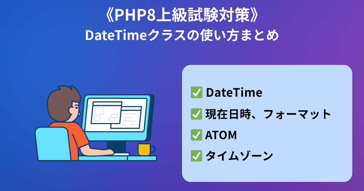 PHPで日付・時刻を扱うとき、DateTime クラスは欠かせない存在です。上級試験でも「現在日時の取得」や「フォーマット出力」の理解は必須。この記事では、DateTime の基本動作を確認しつつ、実行結果の仕組みを図解でわかりやすく整理します。
