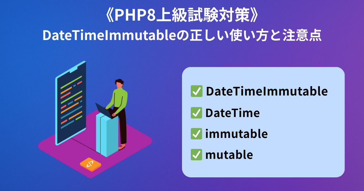 PHP8の上級試験では、DateTime と DateTimeImmutable の違いを問う問題がよく出ます。DateTimeImmutable は名前の通り「変更できない日付時刻オブジェクト」であり、add() や sub() を呼んでも 元のオブジェクトは変化せず、新しいオブジェクトが返る という挙動を正確に理解する必要があります。
