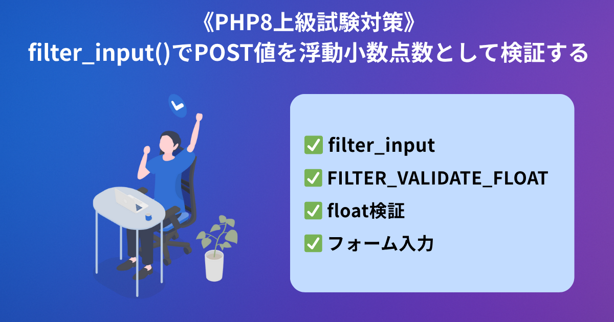 PHP8の上級試験では、外部から受け取った値を検証する関数の理解が問われます。filter_input()はフォームやURLパラメータから値を取得し、オプションでフィルタリングできる関数です。本記事では、特にFILTER_VALIDATE_FLOATを使った浮動小数点数の検証方法をわかりやすく解説します。
