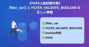 PHP8の上級試験では、外部から受け取った値を検証する関数の理解が問われます。filter_input()はフォームやURLパラメータから値を取得し、オプションでフィルタリングできる関数です。本記事では、特にFILTER_VALIDATE_FLOATを使った浮動小数点数の検証方法をわかりやすく解説します。