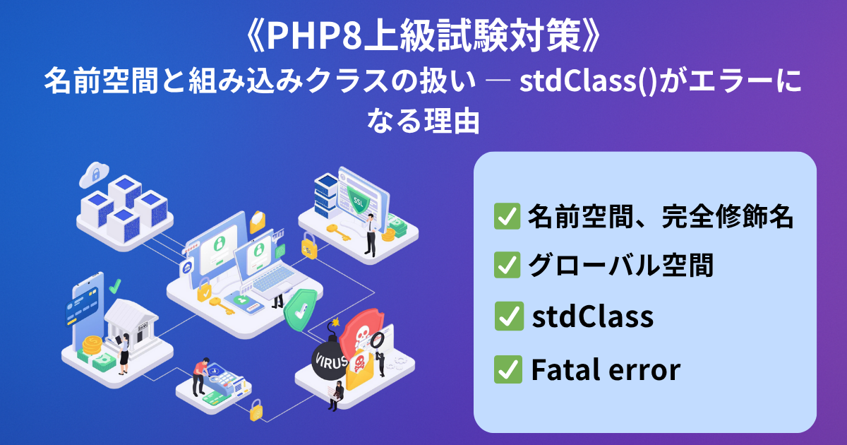 PHPの名前空間を使っているときに、うっかり「組み込みクラス」を関数のように呼び出してしまうと、致命的エラー(Fatal error) に遭遇することがあります。本記事では、stdClass() を例に、「なぜエラーになるのか」「正しい呼び方はどうするのか」をわかりやすく図解します。