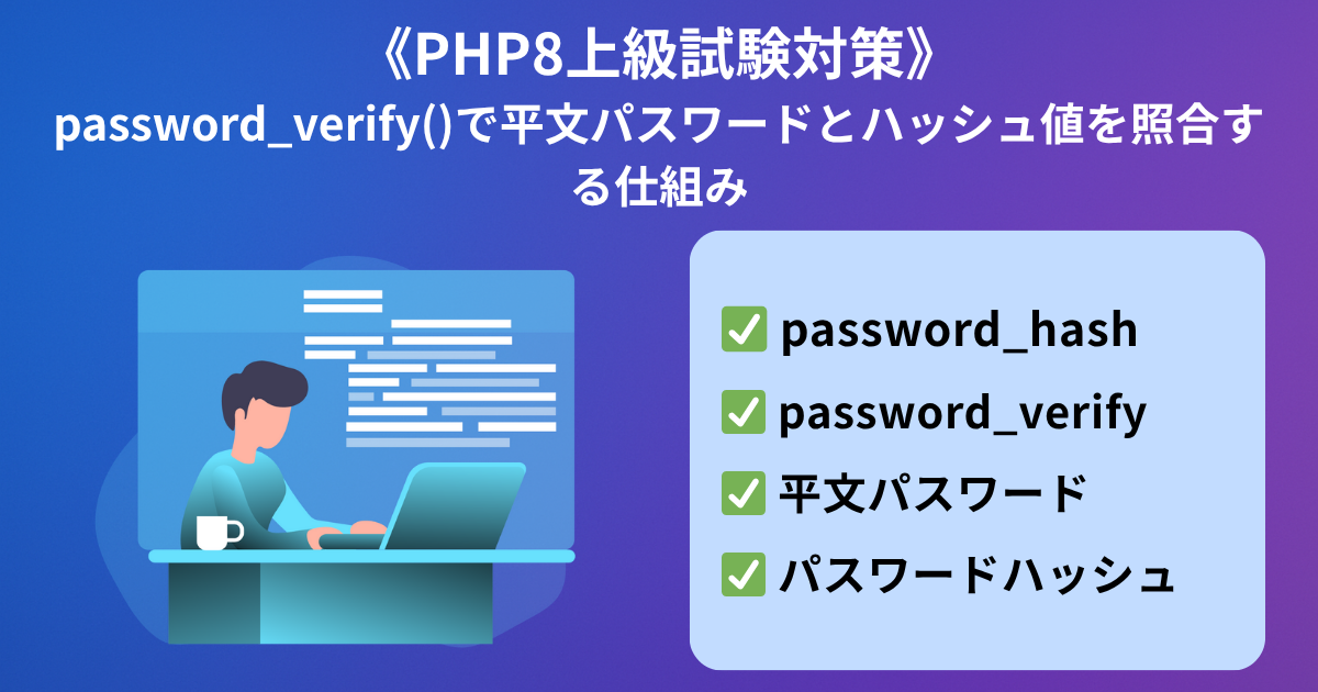 パスワード認証では、ユーザーが入力した平文パスワードと、データベースに保存されたハッシュ化済みパスワードを比較する必要があります。しかし、ハッシュは一方向変換のため「そのまま比較」できません。このとき活躍するのが、password_verify()