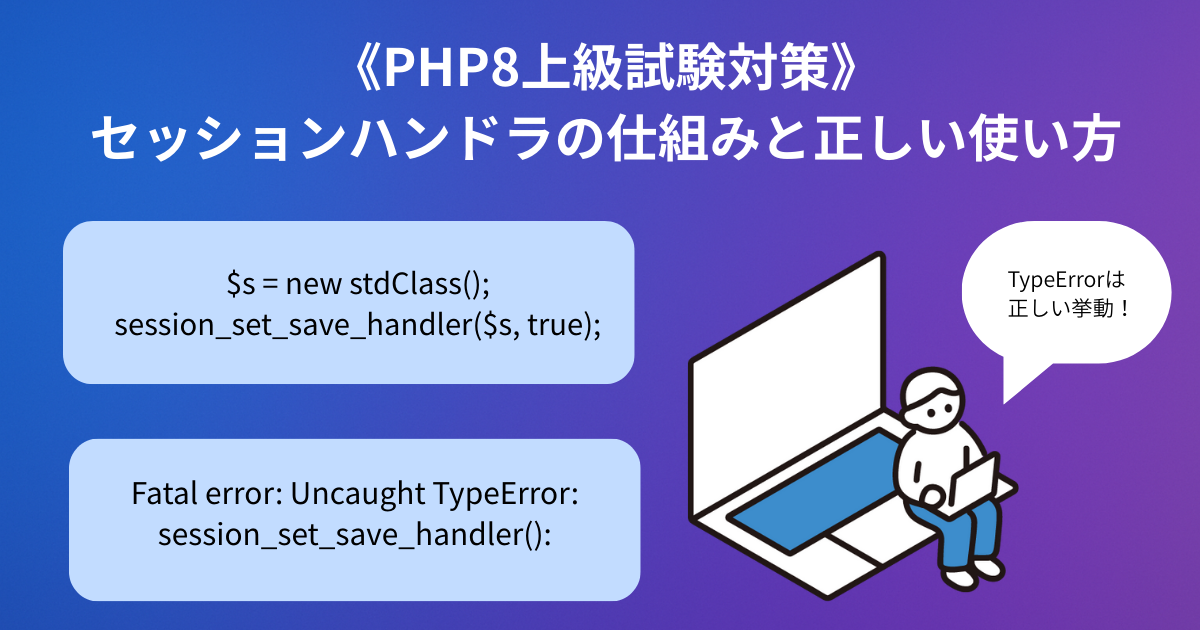 PHP は SessionHandlerInterface を実装したオブジェクトを期待しているため、型エラー(TypeError)となります。