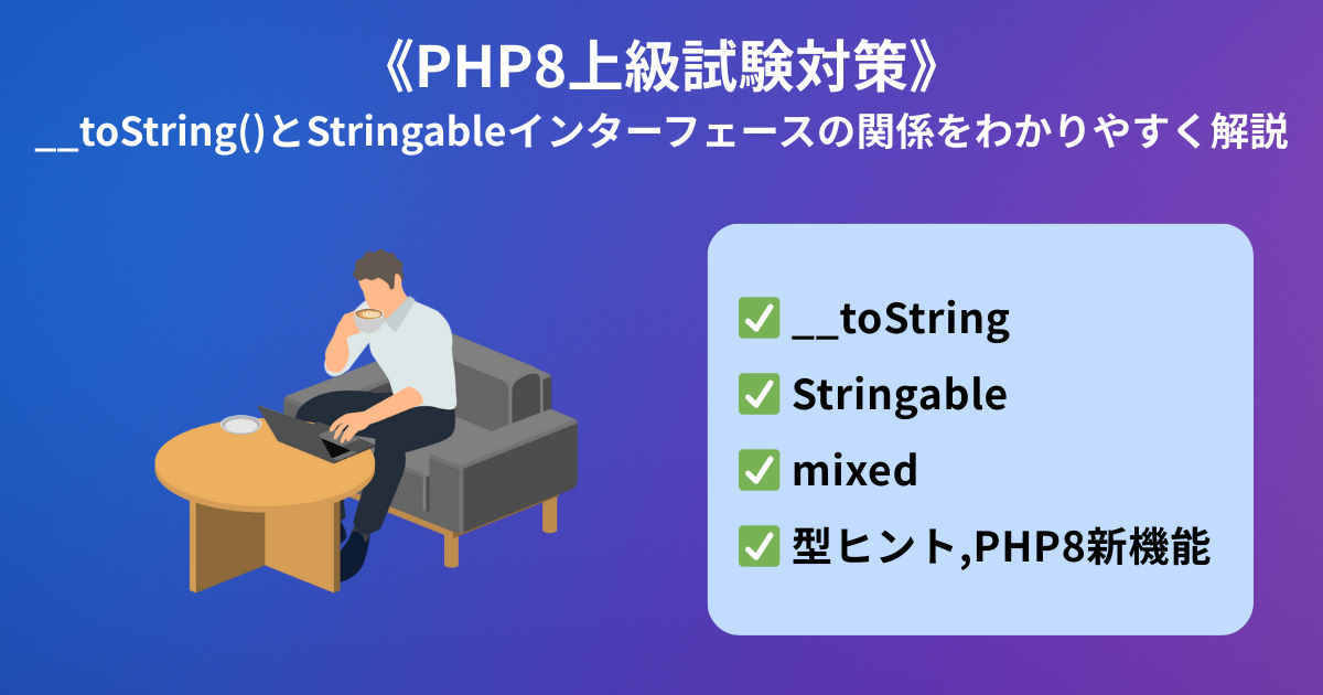 PHPでオブジェクトを文字列に変換する際に活躍するのが __toString() マジックメソッド です。さらにPHP8からは、Stringable というインターフェースが追加され、__toString() を持つクラスを型で表現できるようになりました。この記事では、試験対策の観点から「実行結果の確認」と「Stringableの役割」を整理して解説します。