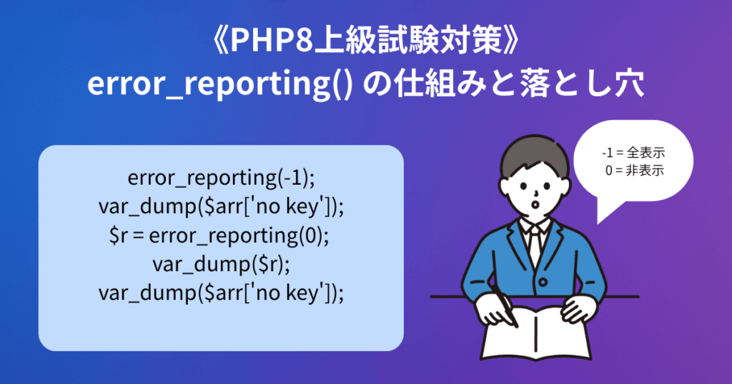 はじめに PHP8技術者認定試験の問題集を解いていると、error_reporting() に関する設問で「一見正しいように見える説明」が誤りで、正解になるケースがあります。本記事... -